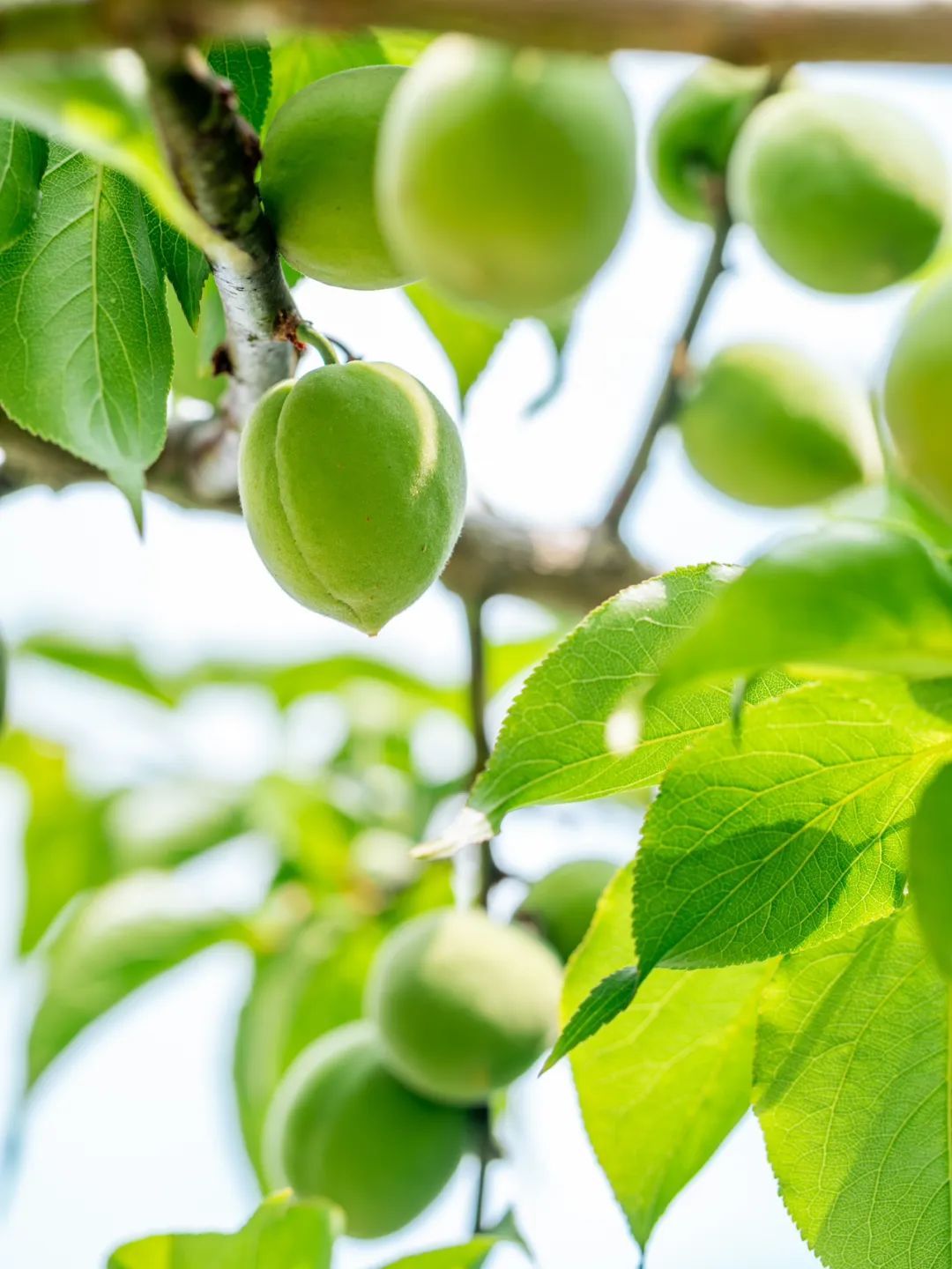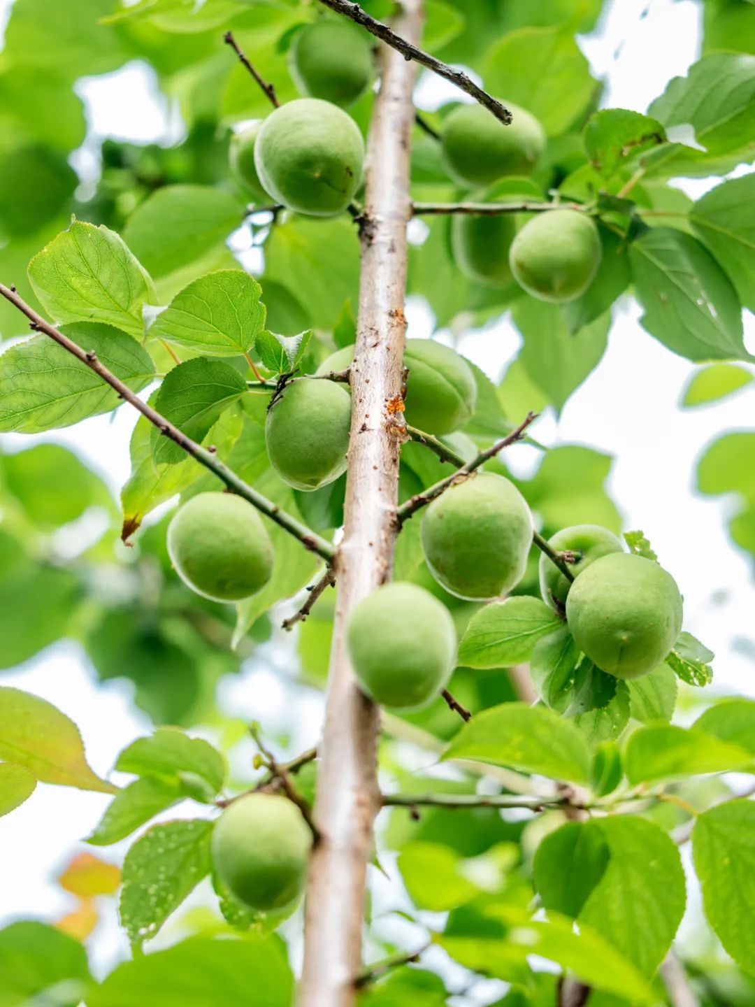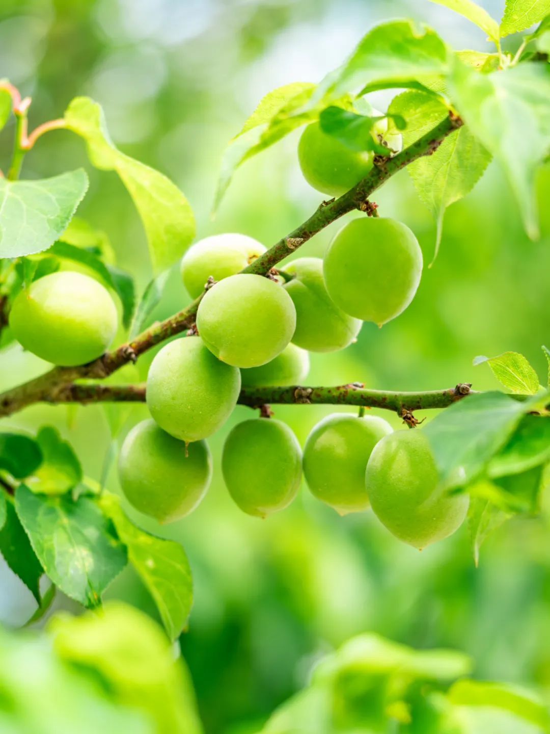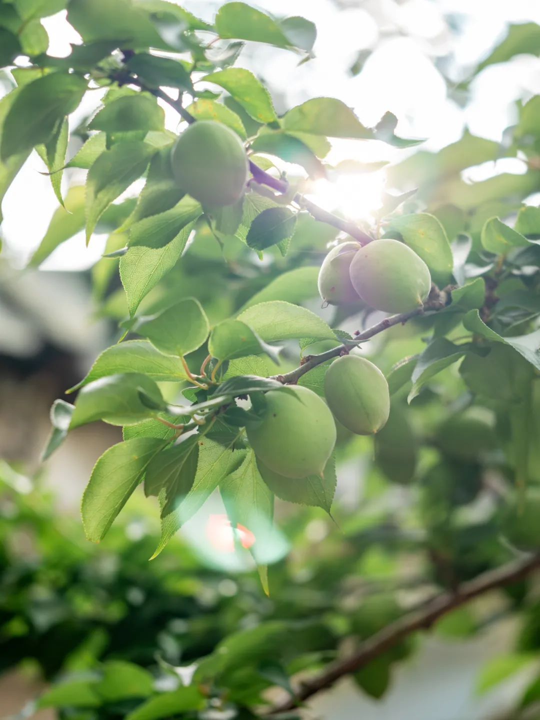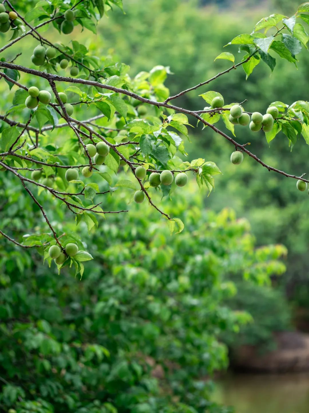 青梅果圆鼓鼓的,翠绿中透着青涩,与满眼新绿的梅树叶子构成十分清新美好的画面,赏心悦目。