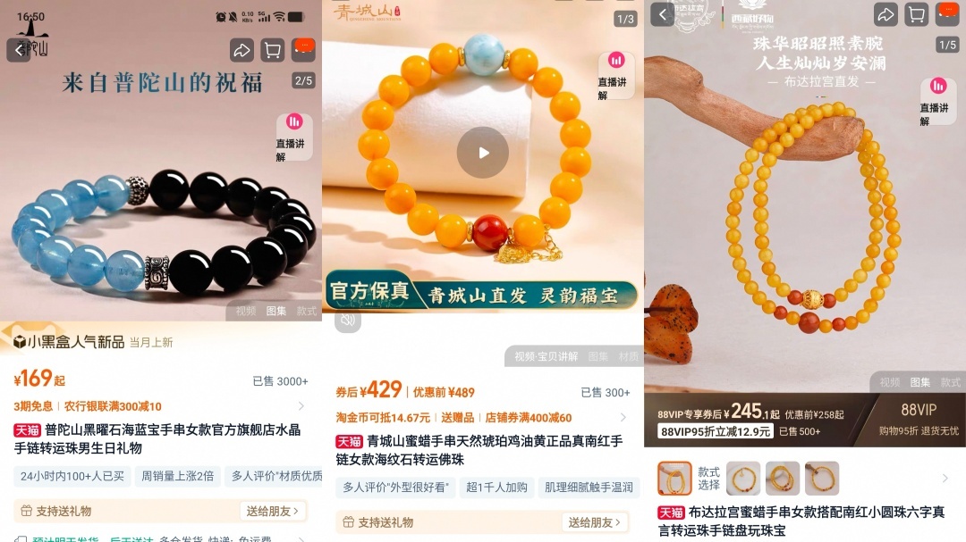 记者从淘宝了解到,目前,全国超过70座寺庙都在淘宝有店。过去一年,相关中式手串售出了超过60万件,如前两年灵隐寺十八籽手串的爆火。同时,过去一年,淘宝上手串商品成交暴涨566%,仅普陀山旗舰店去年便卖出了近30万条手串,成交增速超过不少大牌手链。