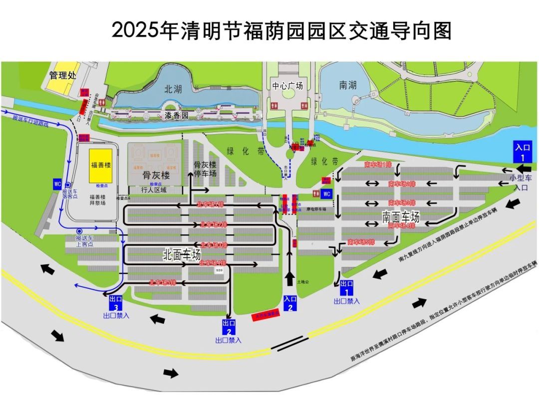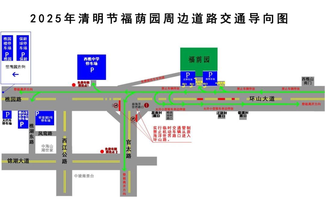 除墓园停车场外,车辆请在现场交通标志和人员指引下,在虹岭路(燕京啤酒路口至纵向三路)双向双边临时停放车辆;以及桃园路南侧(西南延长线至虹岭路口段)、桃园路北侧(聚龙村公交站至西南延长线路段)靠右侧临时停放;水库西路、科技西路、纵一路、纵二路、工业大道,双向双边靠右侧临时停放。大巴、中巴禁止驶入墓园。