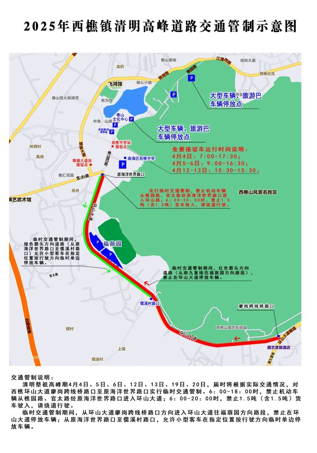届时将根据实际交通情况,对西樵环山路廖岗跨线桥路口至原海洋世界路口实行临时交通管制。6时至18时,禁止机动车辆从樵园路、官太路经原海洋世界路口进入环山路;6时至20时,禁止1.5吨(含1.5吨)货车驶入,货车请绕道行驶。
