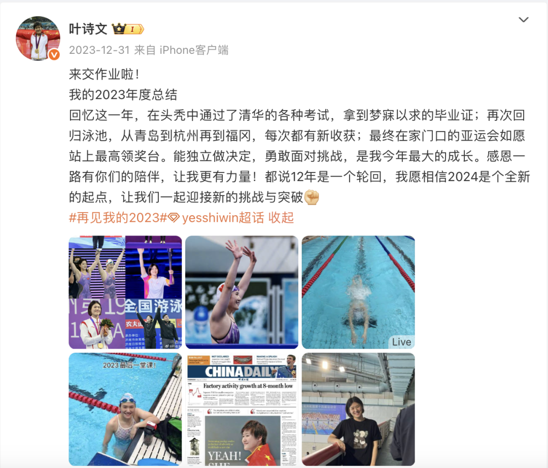 在2012年伦敦奥运会上,年仅16岁的叶诗文以破世界纪录的成绩夺得女子200米混合泳金牌,又以破奥运纪录的成绩夺得女子400米混合泳金牌,她成为中国游泳史上首位奥运双冠王。2014年,叶诗文被保送进入清华大学,就读法学院。之所以选择难度较大的法学专业,她当时透露,恩师徐国义建议她学习法学专业,希望将来退役以后能够有真才实学,以后不管从事什么工作都有益处。2023年年末,历时9年,叶诗文毕业:“回忆这一年,在头秃中通过了清华的各种考试,拿到梦寐以求的毕业证。”遗憾的是,徐国义并未能见证爱徒的这张得来不易的成绩单,他于2020年因病去世。
