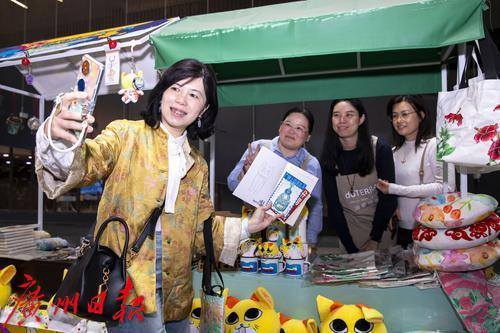 观众购买文创产品后合影留念。