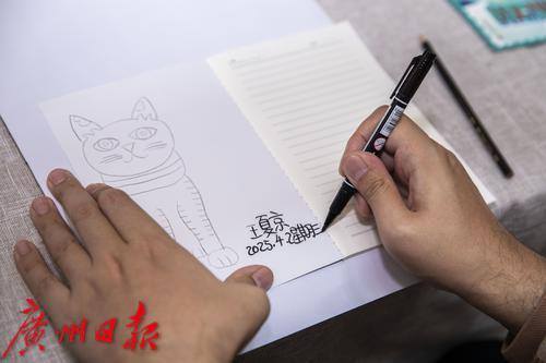 “能不能请你在本子上给我画一直Tigar猫,再签个名?” 听到面前小姑娘的话,王夏京将本子接过来,翻开,在封面的内页上用铅笔画下一直胖胖的猫。 这只“Tigar猫”是他的个人IP。31岁的他是一位孤独症青年,但却通过画笔展现着沉默寡言背后奇思妙想的艺术世界。18年来,他画了2000多幅作品,成为了广州市美术家协会特殊艺术家委员会委员。