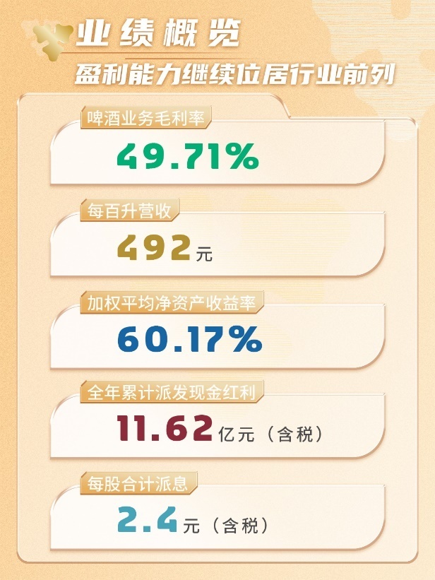 公司盈利能力继续位居行业前列。公司全年实现营业收入146.45亿元,归母扣非净利润12.22亿元,营业利润31.85亿元。啤酒业务毛利率达49.71%,每百升营收492元,加权平均净资产收益率达60.17%。