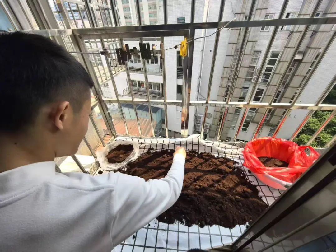 在社工和社区居委的组织下,志愿者们前往瑞幸门店,细心收集其产出的咖啡渣,并将这些带着淡淡焦香的褐色粉末带回家进行晾晒,让其开启为期七天的“日光SPA”。