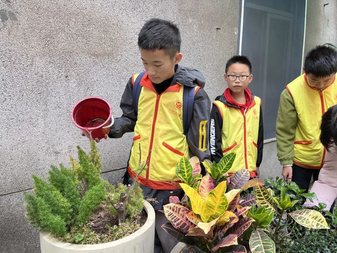 志愿者给植物浇水。