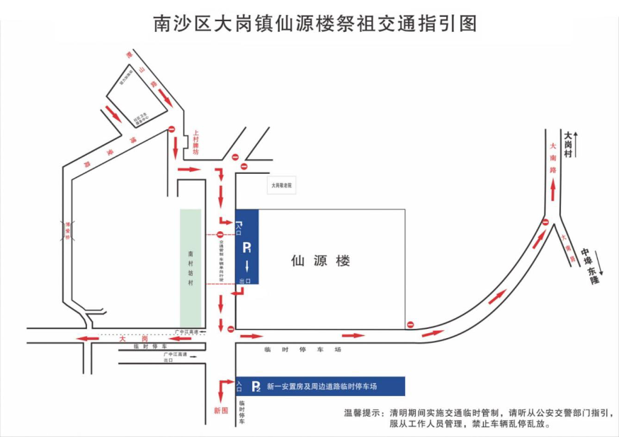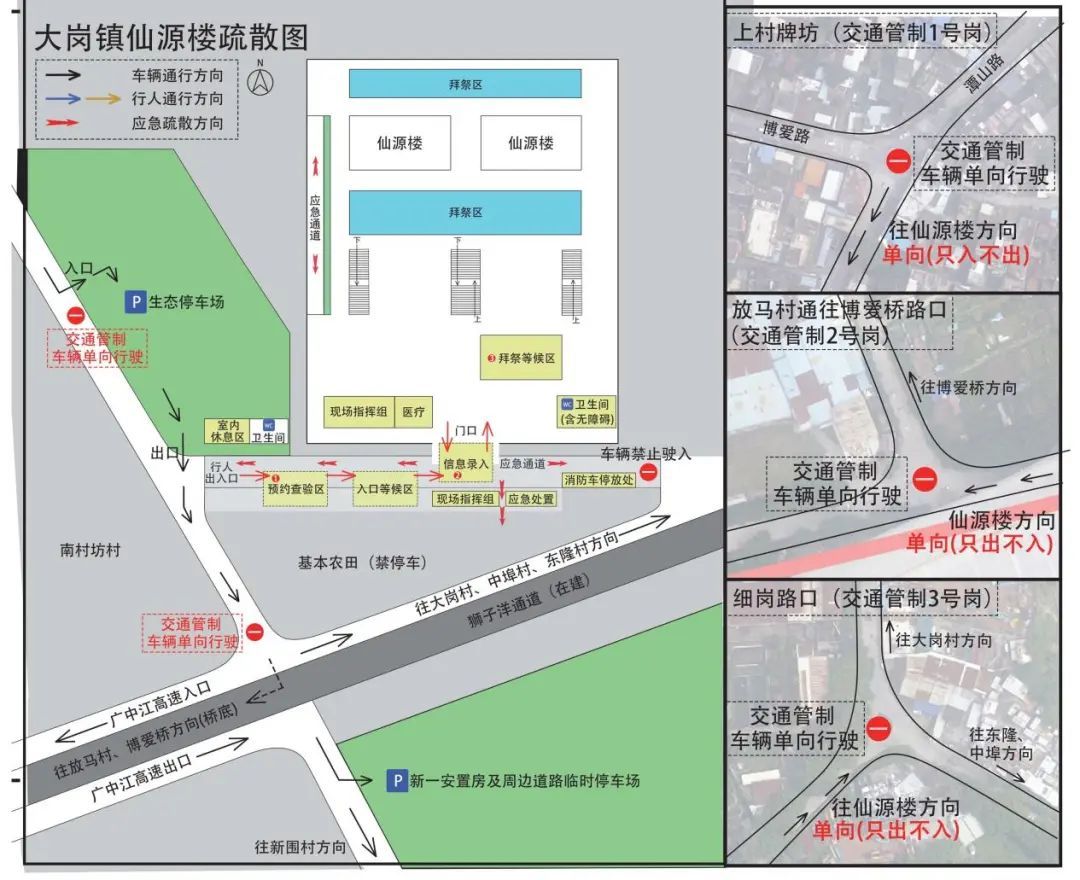 4月4日、5日、6日、12日、13日、19日、20日共有7天为清明祭扫高峰,大岗镇将对仙源楼周边道路实施临时交通管制: