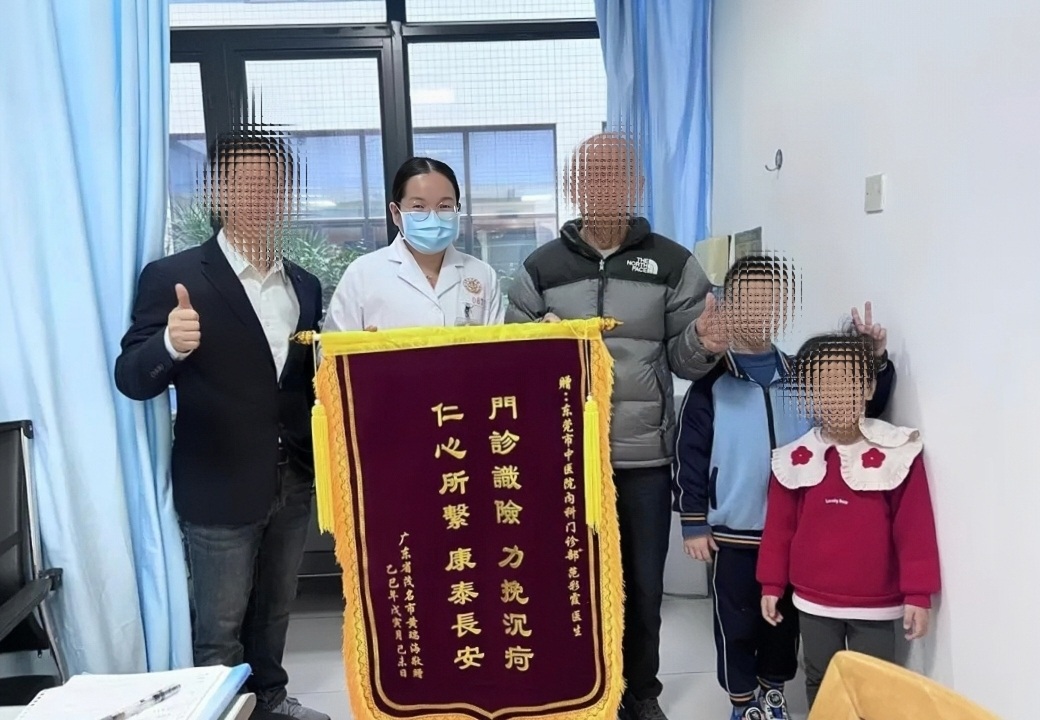 日前,黄先生带着72岁的父亲和两个年幼的孩子,来到东莞市中医院,向中心门诊部范彩霞医生、内四科黄广文医生、外一科邓锐斌医生和内四科、检验科分别赠送锦旗,表达一家人心底无尽的感激。