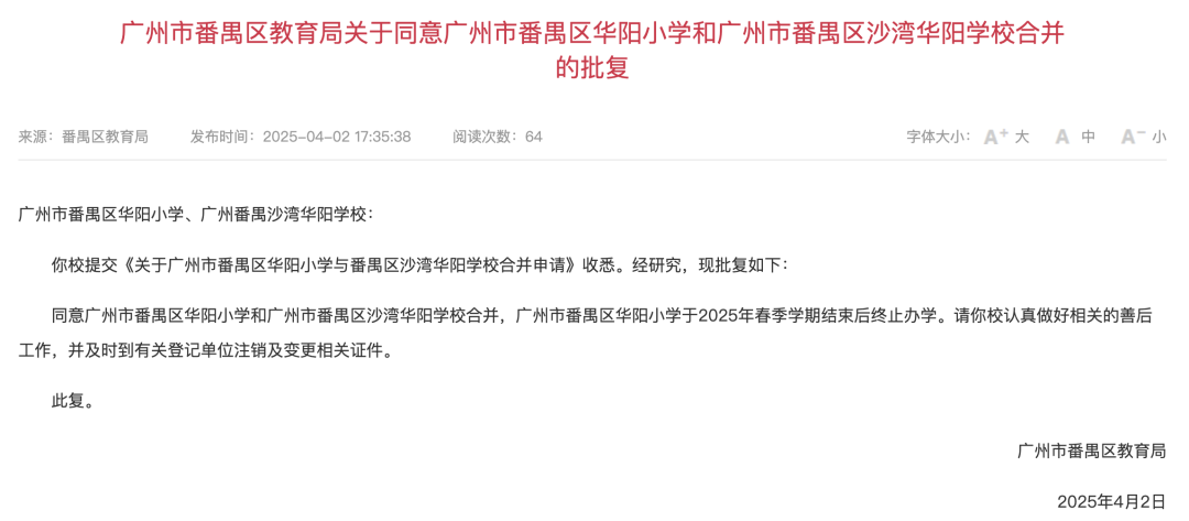 4月2日,广州市番禺区教育局发布两则同意学校合并的批复。