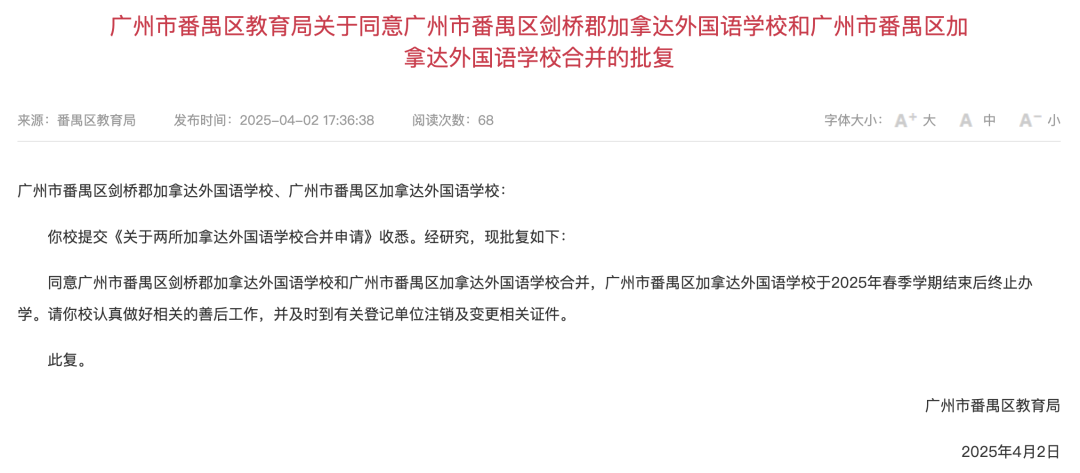 其中,广州市番禺区剑桥郡加拿达外国语学校和广州市番禺区加拿达外国语学校合并,广州市番禺区加拿达外国语学校于2025年春季学期结束后终止办学。广州市番禺区华阳小学和广州市番禺区沙湾华阳学校合并,广州市番禺区华阳小学于2025年春季学期结束后终止办学。