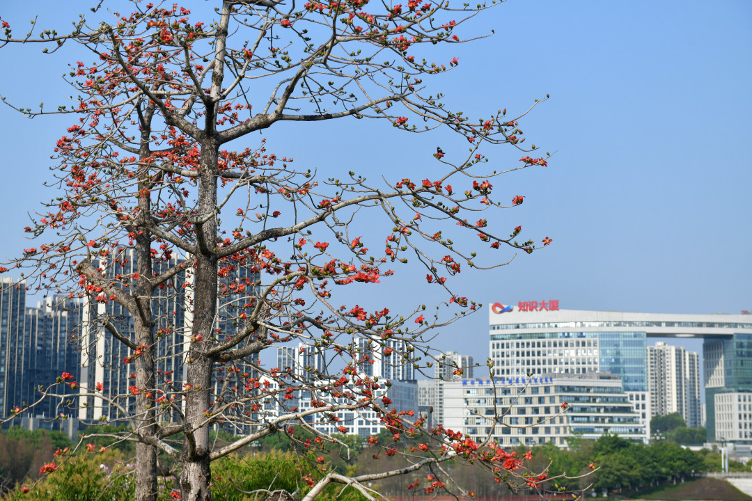 在当下时节,不仅创业公园内的风景宜人、环境优美,走出公园,沿着香雪三路往两边走,沿途的木棉花也正开得火红热烈。木棉花朵大而红,花开艳丽,花朵簇拥枝头,如漫天红霞洒满天际般壮丽,也吸引了不少路人驻足拍照打卡。