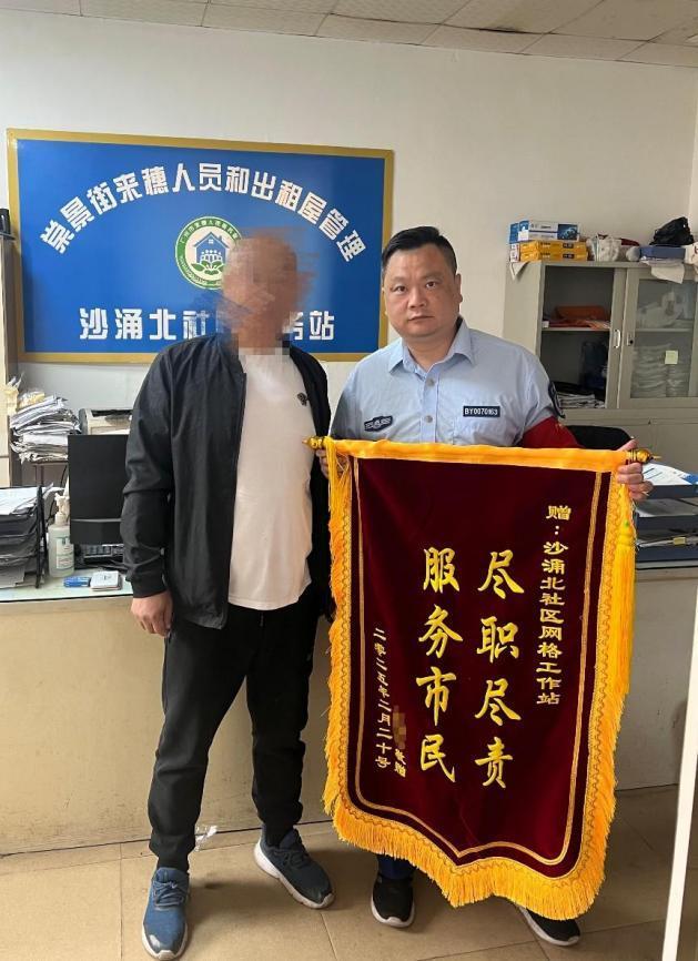 近日,广州市白云区棠景街沙涌北社区的袁先生将一面印有“尽职尽责、服务市民”的锦旗送到社区网格工作站,向社区网格员颜锦棠、陈广深表达诚挚感谢。