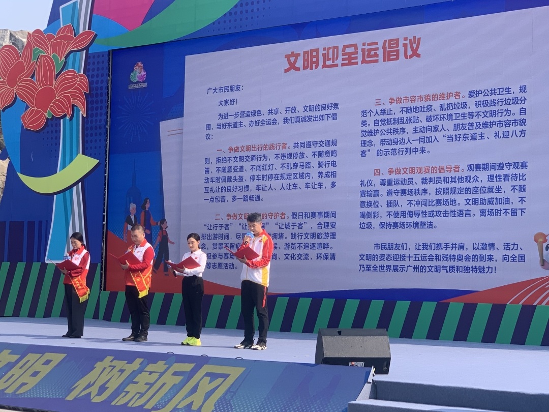 “文明,不仅体现在赛场上,更体现在我们日常生活的点点滴滴中。”2010年广州亚运会男子花剑团体冠军、2011年意大利击剑世界锦标赛男子花剑团体冠军朱俊,第29届、第31届世界蹦床锦标赛冠军蔡琪子,全国道德模范、“全国最美志愿者”赵广军,“中国好人”“全国最美志愿者”、广州市道德模范陈晓霞四位代表上台,共同发布“文明迎全运”倡议。他们字字铿锵,号召全体市民一起积极践行文明风尚,争做文明出行的践行者、文明礼仪的守护者、市容市貌的维护者、文明观赛的倡导者,以文明素养和昂扬姿态,携手迎接十五运会和残特奥会的到来,向全国乃至全世界展示广州的文明气质和独特魅力。