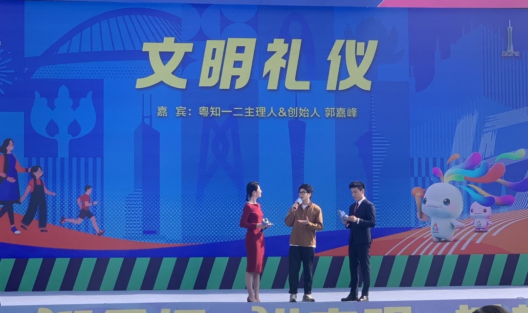 现场气氛最高的当属深受大众喜欢的粤语脱口秀演员郭嘉峰也来到台上,以其拿手的粤语“爆梗”,与现场观众互动餐桌文明和饮茶文明,赢得观众阵阵掌声。在谈到如何做好东道主、做一名文明观众,他还分享了在体育观赛时的礼仪:“我们广东人都是非常热情,所以我们在观赛时,多以鼓掌的方式鼓励我们喜欢的选手或者对方选手,同时我们在拍照的时候,不要打开闪光灯,避免影响场上的运动员。”郭嘉峰还借用富有广州地道特色的“汤水”发出倡议:“我们不仅要煲好老火靓汤,还要煲好文明高汤,让来自八方的客人品尝温暖。”