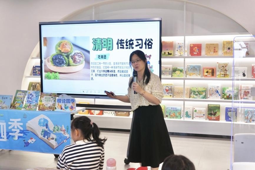 燕子姐姐开展趣味十足的“猜图大闯关”游戏,向小读者介绍清明节的传统习俗,还带着孩子们共读著名儿童文学作家保冬妮的中国节日绘本故事《奶奶的青团》。在轻柔的故事声中,孩子们仿佛置身于一个充满亲情和关爱的江南小镇,在满眼新绿的清明时节,感受奶奶温暖的陪伴,祭奠祖先的伤感,以及踏青赏春、亲近自然的美好气氛。原来,清明不只是伤感的节日,更是传承与感恩的日子。