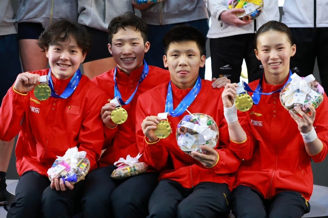 赛后,为中国队取得开门红的四人都非常开心。陈艺文说这是巴黎奥运会后第一场决赛,混合团体一直都是非常轻松的项目,大家心态挺放松,所以她很享受比赛。第一次参加国际大赛的程子龙最兴奋,他坦言比赛非常刺激,他在比赛中努力克服紧张的心态,也相信自己能做好,能拿下感觉非常好。陈芋汐心态平稳,她说本次比赛还是以锻炼为目标,继续积累经验,发挥出训练水平即可,最开心是自己两个昨天失误的动作都跳好了。而王宗源坦言发挥很差,但失误也给了自己一个警惕,但他坚信队友能追回来,对于下月在北京举行的今年世界杯跳水总决赛,他说对新规则的挑战有点期待,因为存在更多不确定因素,让自己感觉更刺激、紧张和好玩。