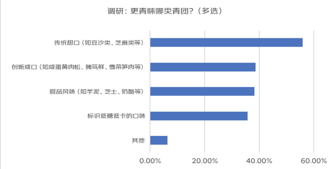 调研显示,63.7%的消费者清明节期间首选青团。从口味类型的选择上,传统甜口仍是大部分消费者的首选,同时如腌笃鲜、雪菜笋肉等创新咸口也被更多消费者关注,也有部分消费者将青团当成甜品食用,会更多关注芋泥、奶酪、芝士等甜品风味。