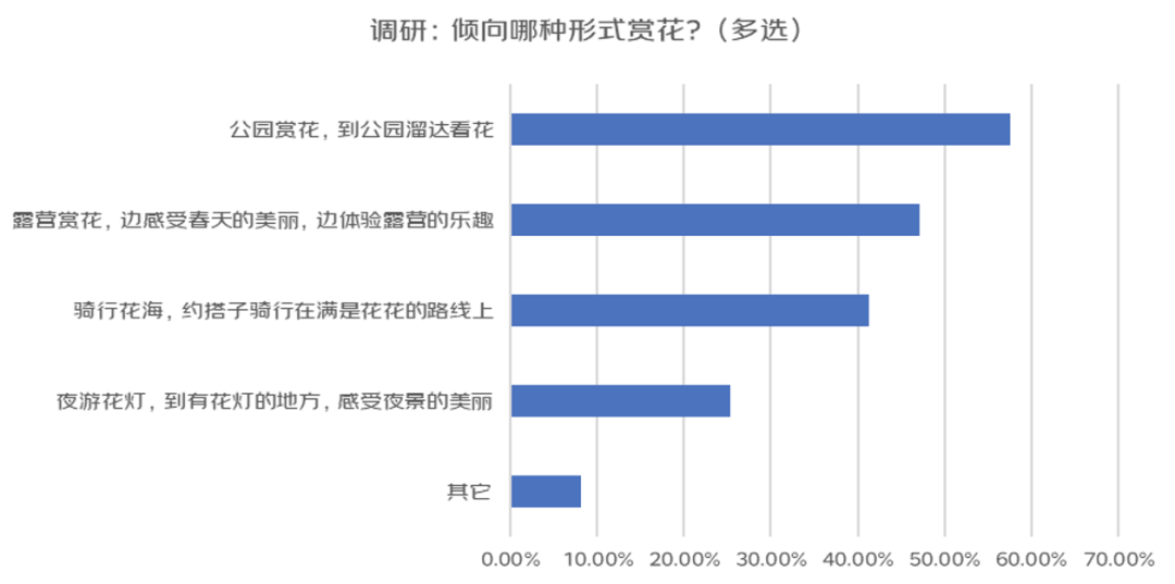 数据显示,57.6%的调研用户这个清明节小长假都倾向“公园赏花”,轻松自在地“溜达看花”成为首选,47.1%的调研用户选择“露营赏花”,还有超四成调研用户选择“骑行花海”,也有25.4%的用户会选择“夜游花灯”,赏花形式花样百出;赏花穿搭更是百花齐放,61.3%的调研用户青睐“松弛感遛弯风”、16.6%的调研用户青睐“古风韵味汉服风”,人们追求赏花的时候“大饱眼福”,也追求将其记录下来成就“刹那永恒”,因此,“出片”是春日赏花永恒不变的主题。