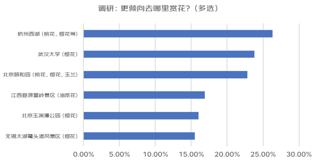 这个假期,大家想去哪里赏花?调研显示,26.3%的调研用户选择去杭州西湖赏桃花和樱花,“上有天堂,下有苏杭”;武汉大学的樱花久负盛名,23.8%的调研用户都选择去武汉大学赏樱;还有22.8%的调研用户选择去北京颐和园赏桃花、樱花、玉兰,江西婺源篁岭、无锡太湖鼋头渚风景区等赏花地也成为大家的热门选择。