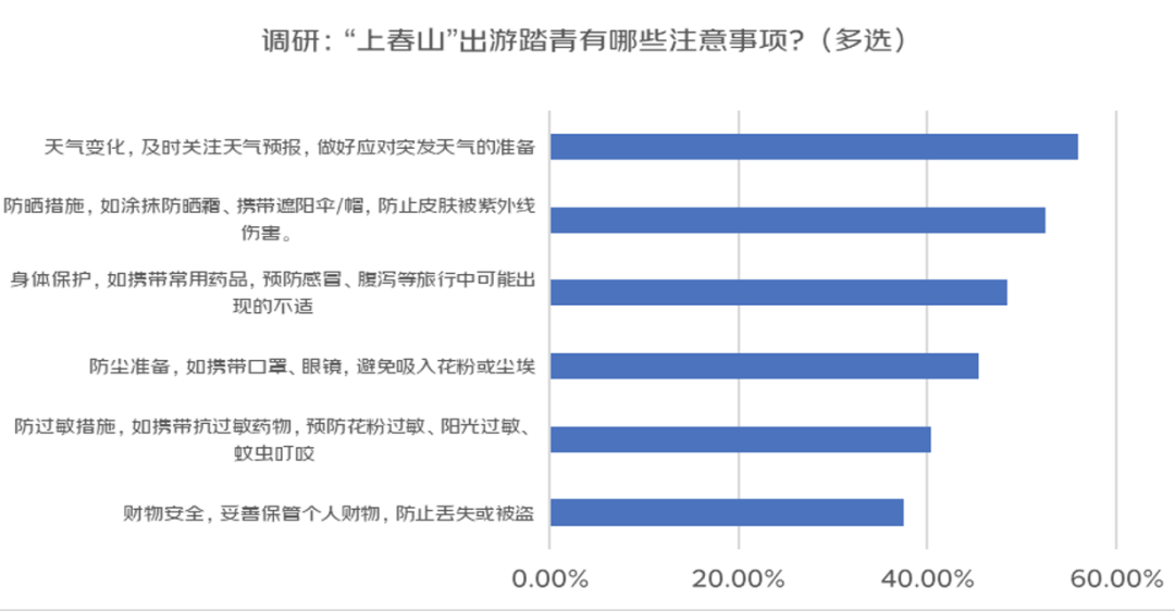 4月气候宜人、万物复苏,正是踏青出游,登山寻野的绝佳好时候。当大众对旅游的需求从过往的“拍照打卡式”转变为“愉悦身心式”,“上春山”的目的地不再只有三山五岳“大热门”,慢节奏、疗愈式、沉浸式体验春景的小众景点成为大家“反向旅游”的新选择,调研显示,15.8%的人清明节“要去婺源上春山,古村徒步,欣赏万亩梯田油菜花海”,12.8%的人“要去青城山,探寻道家文化,享受春季的清新与宁静”……除了松弛感拉满,“爱自己”更体现在上春山过程中的方方面面,“防晒”“防尘”“防过敏”“身体保护”等是消费者注意的关键点。