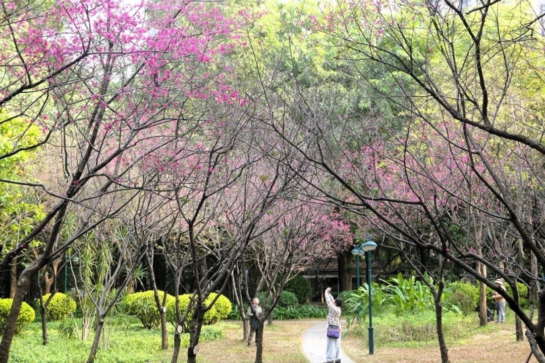 在珠江公园,市民游客在赏花