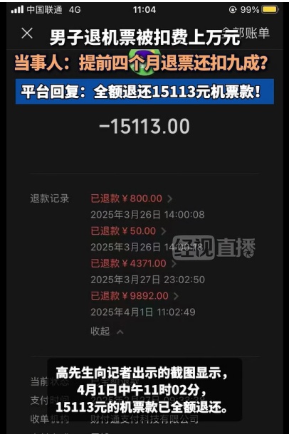 据媒体报道,4月1日,平台决定全额退还高先生1.5万元机票款。
