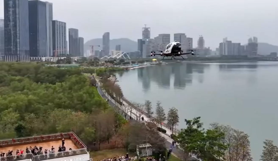 与机器人共舞结束后,甲亢哥体验了深圳宝安区城市空中交通运营示范中心的自动驾驶飞行器。这架无人驾驶载人航空器由亿航公司生产,无需专业飞行员操作,入座即可起飞。于是,“甲亢哥”开启了充满“惊声尖叫”的5分钟高空之旅。落地后,“甲亢哥”兴奋大喊:“我做到了!它是安全的!”