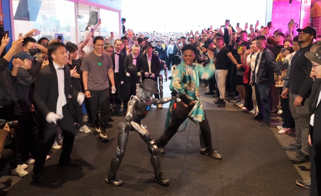 紧接着,在深圳欢乐港湾,他见到了深圳众擎机器人PM01。此前他看过众擎机器人“前空翻”视频,一直惦记着与之较量。现场,他和机器人PM01随着音乐一同舞动,将气氛推向高潮。