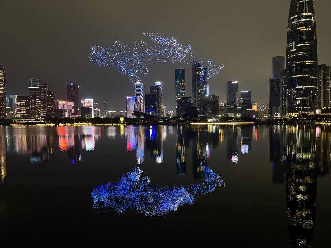 傍晚,在深圳人才公园的人才星光桥上,“甲亢哥”迎来大漠大智控提供的1500架无人机表演秀。编织出巨龙等多个形状的无人机编队在夜空中盘旋,壮观景象让他高声惊叹:“This is China!”“Amazing!”