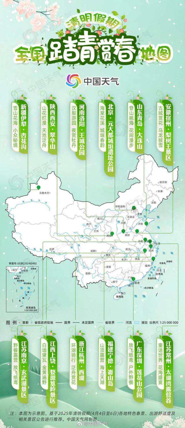 “梨花风起正清明,游子寻春半出城。”我国自古就有清明踏青出游的习俗,此时,梨白柳青、桐花初绽、桃杏争春,正是踏青出游的好时候。这份清明假期踏青赏春地图,带你追寻春天的足迹,邂逅最美春光。