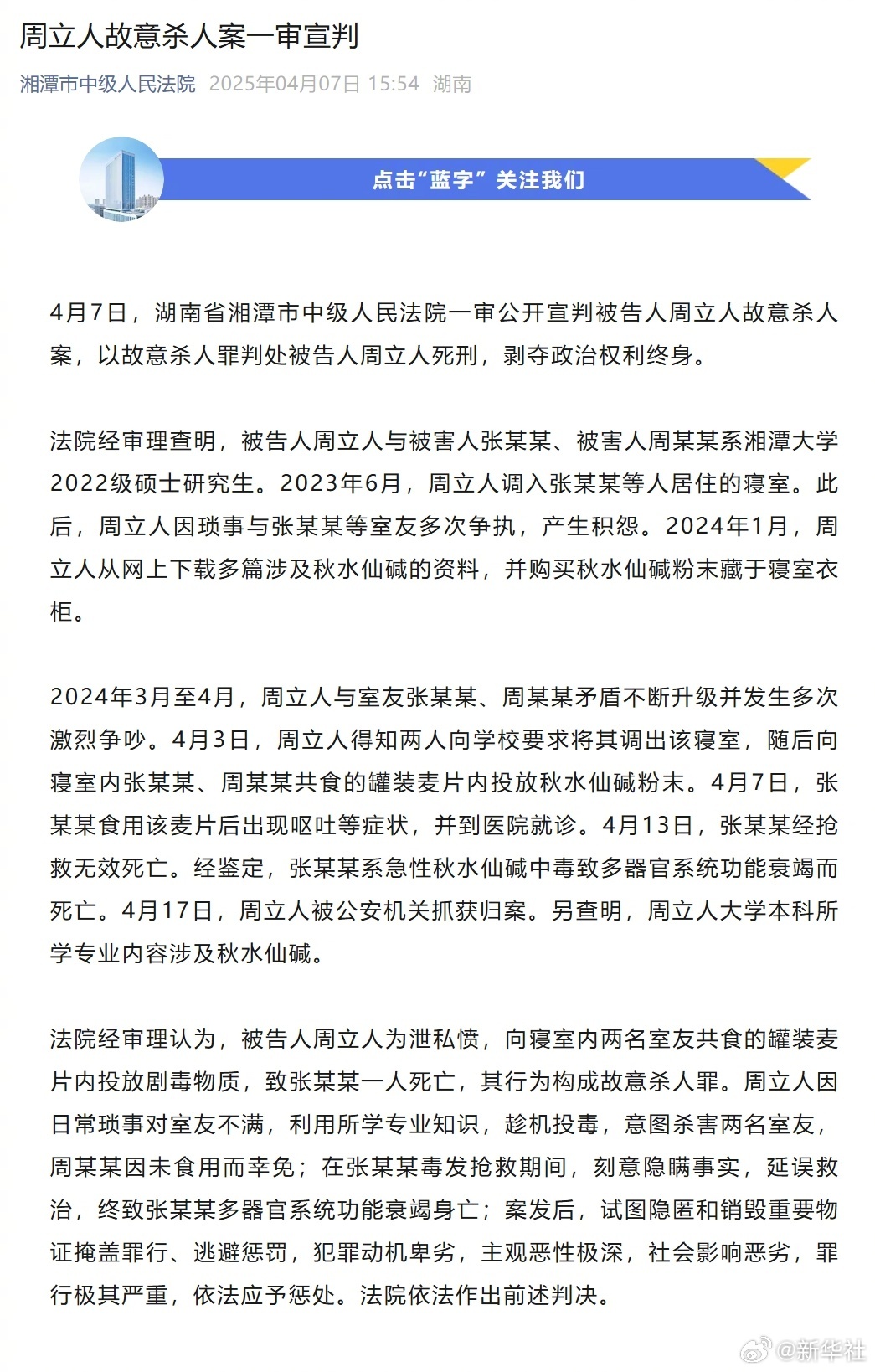 4月7日,湖南省湘潭市中级人民法院一审公开宣判被告人周立人故意杀人案,以故意杀人罪判处被告人周立人死刑,剥夺政治权利终身。