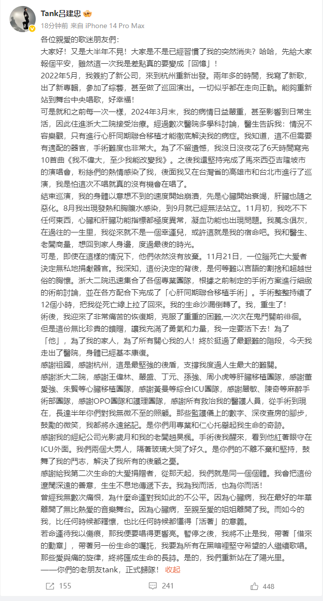 在文章最后,TANK感谢了浙大二院的专家团队、陪伴在旁的工作人员以及这位捐赠者。他表示,“我将不止是我,带着‘借来的勋章’,带着另一份声明的嘱托,我要为所有在黑暗里坚守希望的人继续歌唱。”