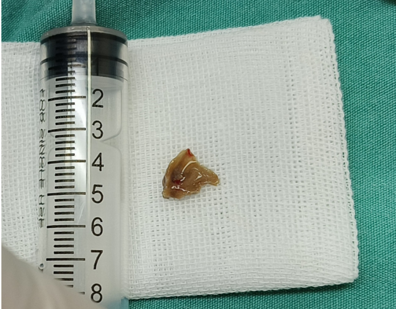 历时20分钟,大小约1.3厘米×1.5厘米的不规则鱼骨被成功取出。术后患者咳嗽咳痰症状显著改善,现已康复出院。