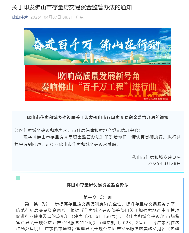 4月7日,佛山市住房和城乡建设局公开发布了《佛山市存量房交易资金监管办法》。