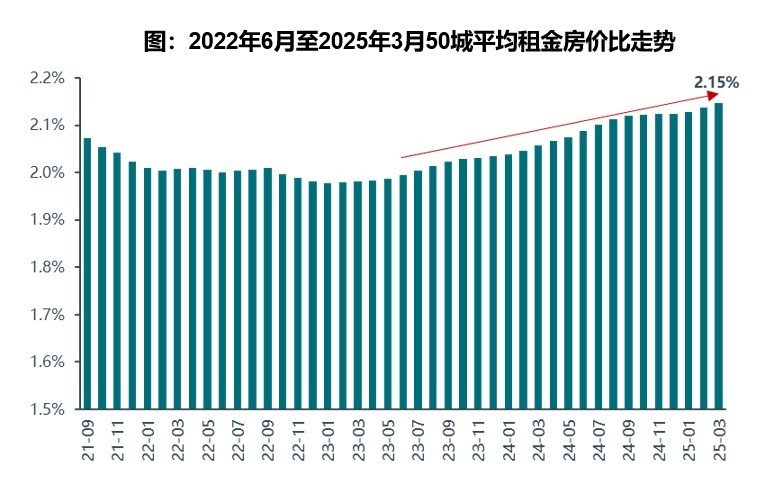 可以看到,近两年在房地产调整周期中,受益于需求刚性,租金下跌幅度相对平缓,重点城市租金房价比持续回升。中指院数据显示,截至2025年3月,50城平均租金房价比为2.15%,较2023年初低点提高0.17个百分点。随着租售比回升和融资运营成本下降,住房租赁产业的商业可持续性增强。