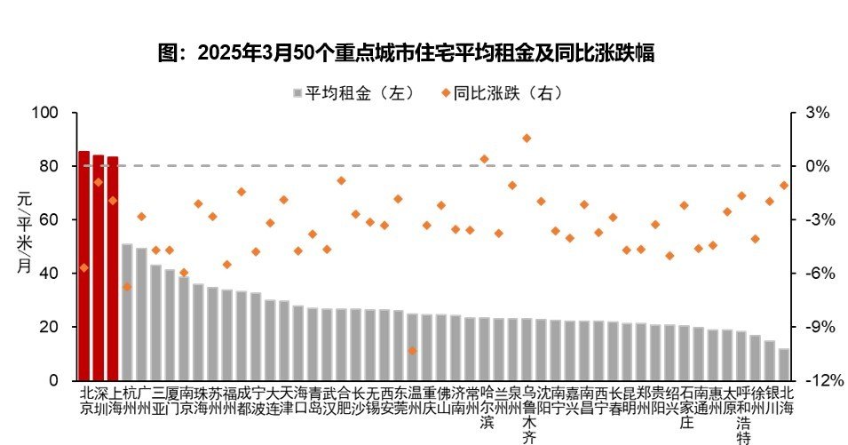 从目前的住房租赁市场来看,中指院的统计数据显示,1-3月,50城住宅平均租金累计下跌0.44%。其中,一线城市住宅平均租金与去年同期基本持平;二线城市累计下跌0.70%,三四线代表城市累计下跌0.46%。截至2025年3月,北京、深圳、上海住宅平均租金在80元/平方米/月以上,明显高于全国其他城市;广州、杭州等4个城市租金在40-60元/平方米/月之间。