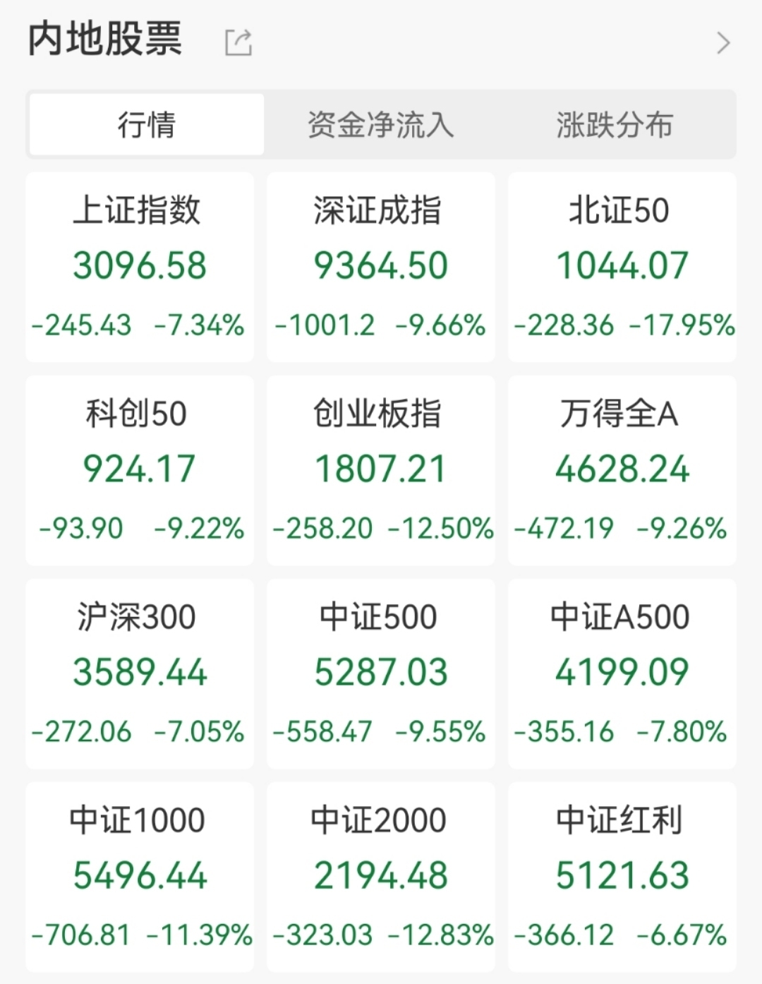 随后,三大指数跌幅有所收窄,上证指数收跌7.34%报3096.58点,深证成指跌9.66%,创业板指跌12.5%。A股成交1.62万亿,较上一交易日增加4597亿元。