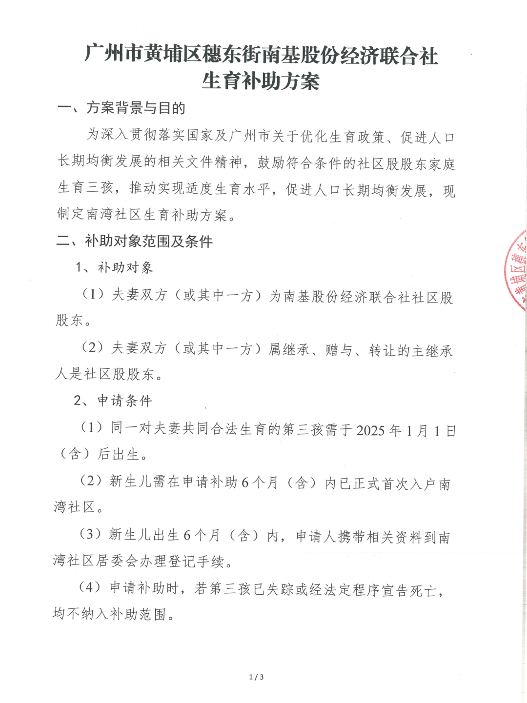 3月26日,广州市黄埔区南湾社区召开党员大会和南基股份经济联合社股东代表大会,审议通过《广州市黄埔区穗东街南基股份经济联合社生育补助方案》,明确规定符合条件的家庭生育三孩可一次性申领50000元生育补助金。