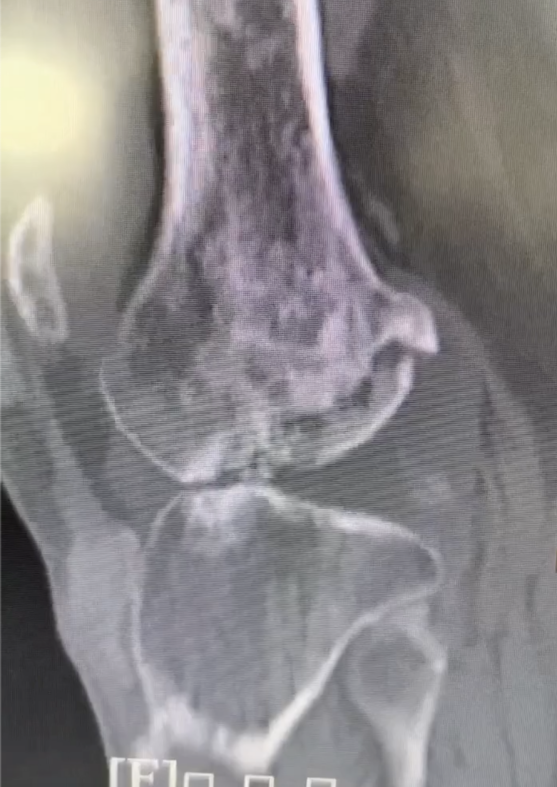 影像显示,患者骨质中布满痛风石,全关节破坏且有部分骨质缺损。