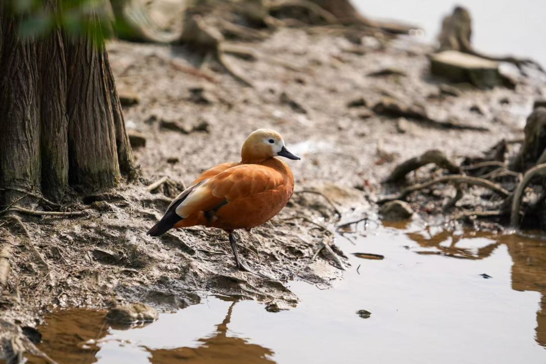 赤麻鸭有比较明显的生理特征,它的羽毛以橙黄色为主,略带棕色,远看像一块会游动的“焦糖面包”,蓬松温暖,展翅时露出“奶油夹心”(白色覆羽)。同时赤麻鸭是个“迁徙达人”,每年春季从南方越冬地飞往北方繁殖地,秋季则从北方返回南方越冬地,此次发现与其春季北迁的时间规律相符。