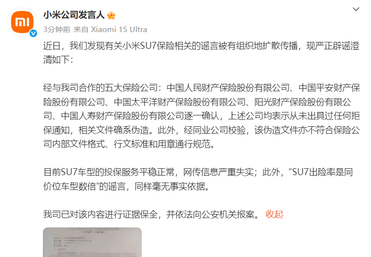 4月7日,“小米公司发言人”微博发文称,近日,公司发现有关小米SU7保险相关的谣言被有组织地扩散传播,现严正辟谣澄清如下: