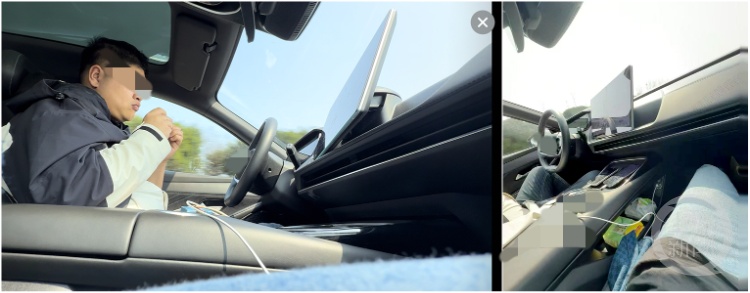 司机在剪指甲(左),司机双手脱离方向盘(右)。 受访者供图