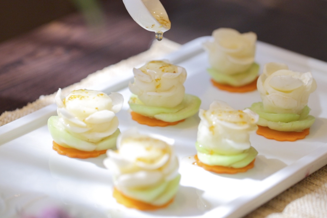 天妇罗火龙果、百香果石榴球都是以水果入馔的菜式。天妇罗是日式烹调法,将火龙果裹上天妇罗面糊,精准控温油炸,让火龙果的自然风味与天妇罗的香脆口感完美结合。风味上,这道菜甜中带脆,层次丰富,既有火龙果的清甜,又有天妇罗的香酥。而百香果石榴球的特色在于将热带水果百香果和红火龙果结合,二者口感互补,创造出独特的风味,甜中带酸,清新解腻。