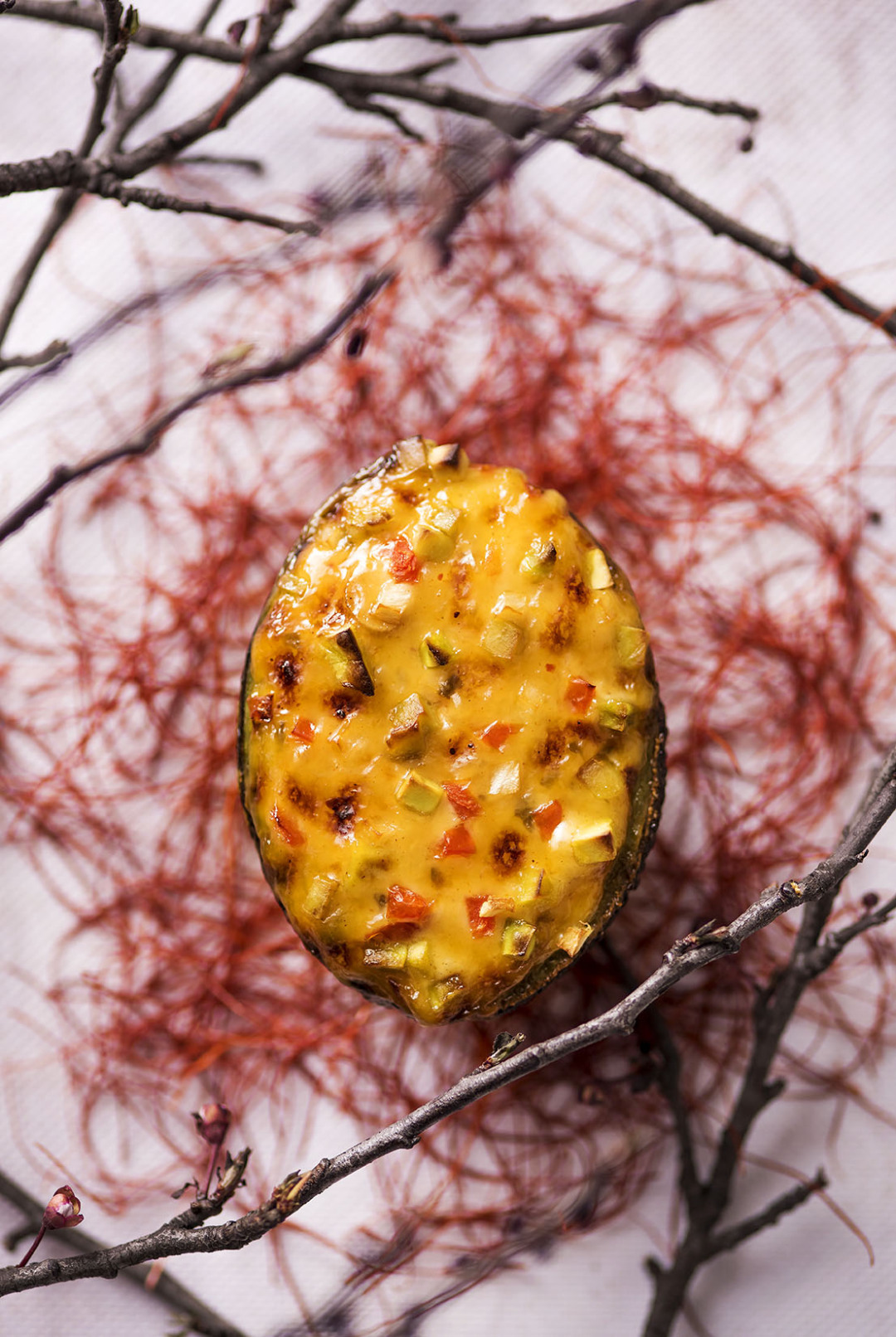 这里的师傅延续粤菜取材多样化的奥义,将食材搭配为更具味觉张力的组合;以原始的调味,呈现素食的生机勃勃。水果、蔬菜等都化为厨师手下的轻盈之味。“焗牛油果”,以牛油果为天然容器,搭配菌菇与时蔬粒点缀,再覆上芝士焗至琥珀色焦糖层,菌菇的鲜美与蔬果的清甜在焗制过程中完美交融。这是素食与法式焗烤的创意碰撞,颠覆了牛油果冷食的传统。厨师采用“焗”的做法,有三大优势:一是令牛油果的口感更加绵密柔润;二是焗烤过程中,高温促使菌菇与蔬菜的鲜香充分渗透至牛油果里,让奶香与菌菇、蔬菜的风味的融合更加紧密;三是高温焗烤能激发牛油果的天然香气,使其本身的奶脂香更为浓郁,同时让它带上微微焦香的独特风味。