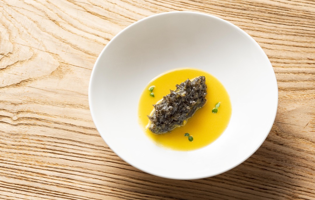 “腰果南瓜汁烩素参”上桌时,令人惊叹其形态的逼真。这素参是以海藻制成,质地Q弹,此菜肴的创新之处在于厨师将南瓜与腰果精心研磨成细腻浓浆,与海藻素参巧妙烩制,实现了风味的深度交融与提升,赋予了菜品甜润不腻、层次分明的口感。