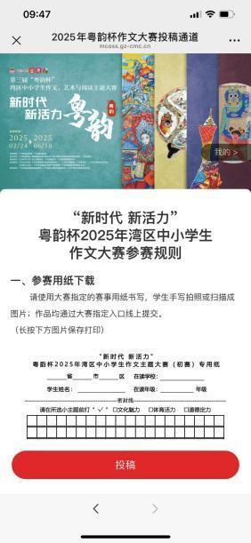 由广州市教育局、广州日报社联合香港、澳门两地教育部门主办的“新时代 新活力”2025年粤韵杯湾区中小学生作文、艺术与阅读主题大赛正在火热进行中。其中,作文大赛报名及初赛投稿将在4月9日截止!请尚未提交作品的参赛者尽快投稿,把握这一展现才华的机会。