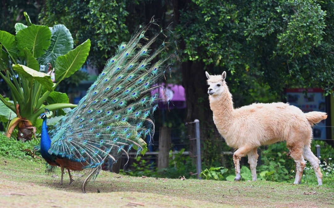 据了解,动物园里的这些孔雀没有圈养,平时自由活动。一开始,小羊驼并不喜欢孔雀来“串门”,经过一段时间,小羊驼也就逐渐接受了对方。如今,小羊驼和雄孔雀和睦相处。