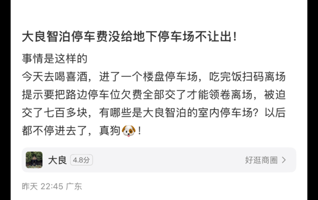 但在顺德,佛山市顺德区智能停车协会相关负责人否认了这一说法。“顺德路边停车都没有统一一个运营商,更不用说控制车场来限制车主的出入。”该负责人在接受广州日报记者采访时表示,目前确实有很多提供线上停车缴费服务的平台,已经将历史欠费数据打通,缴费时会有欠费信息的提醒。“但像大良智泊,是没有采取捆绑缴费的行为的。”该负责人澄清,在商圈停车场出现不缴历史欠费就不让出场的行为,应该是该停车场物业管理方与线上缴费平台系统的行为,与智泊没有直接关系。