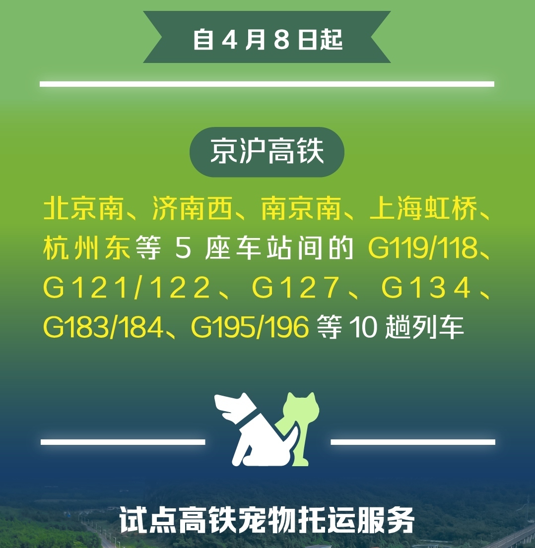 铁路部门在广泛听取旅客意见、深入开展市场调查的基础上,经过专业测试评估,自4月8日起在京沪高铁北京南、济南西、南京南、上海虹桥、杭州东5座车站间的G119/118、G121/122、G127、G134、G183/184、G195/196次等10趟列车上试点高铁宠物托运服务。
