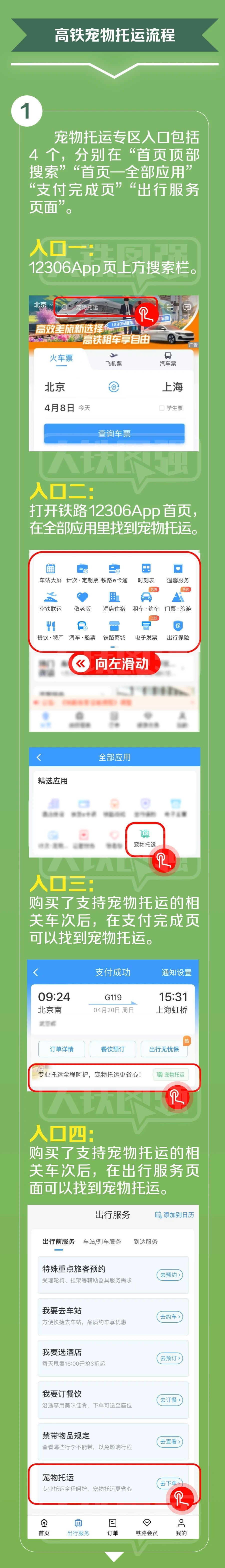 12306上宠物托运专区入口包括4个,分别在“首页顶部搜索”“首页-全部应用”“支付完成页”“出行服务页面”。具体操作如下: